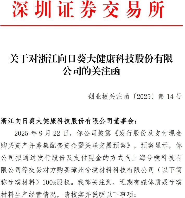 投资时间网、标点财经研究员注意到,在收购交易推进过程中,向日葵于2025年12月收到了深交所发来的《关注函》。彼时深交所表示,关注到有媒体质疑兮璞材料生产经营情况,要求公司就以下事项进行核实说明。