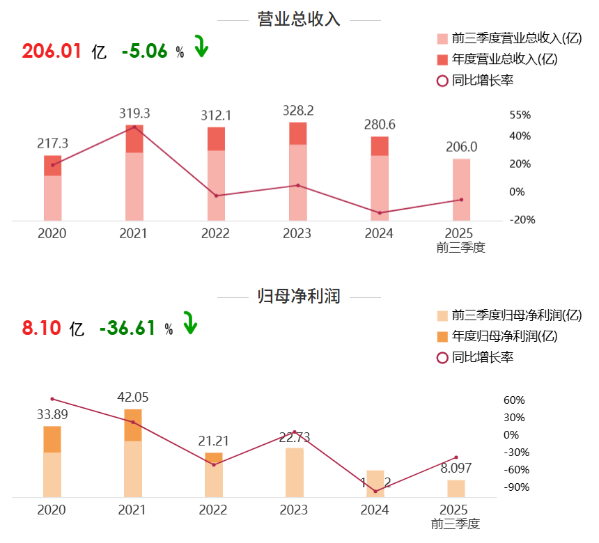 财务数据显示,2024年公司营收同比下滑14.52%,归母净利润降幅更为显著,达到95.24%。进入2025年后,公司业绩压力依旧未得到缓解。截至2025年前三季度,其营收与归母净利润分别同比下降5.06%和36.61%。