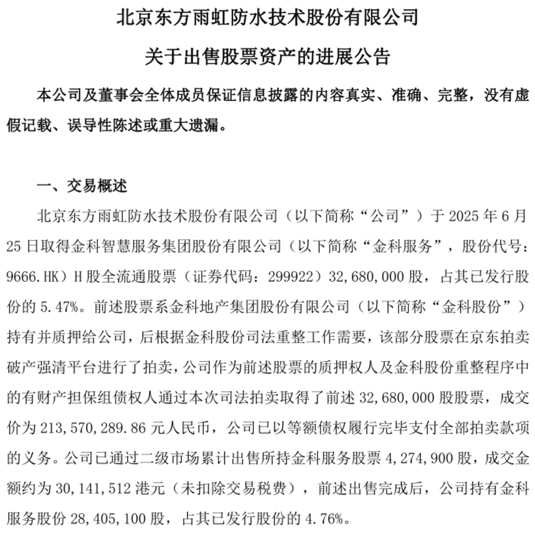 公开资料显示,东方雨虹于2025年6月25日通过司法拍卖获得金科服务3268万股股份;同年10月至11月,其通过二级市场减持427.49万股,回笼资金约3014万港元。2026年1月20日,东方雨虹公告以要约方式完成剩余全部股份的清仓,正式彻底退出该项投资。