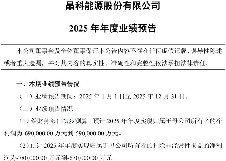 光伏组件龙头厂商晶科能源股份有限公司(下称晶科能源,688223.SH)经历由盈转亏。2026年1月21日晚间,晶科能源披露业绩预告显示,公司预计2025年归母净利润亏损59亿元至69亿元;扣除非经常性损益后,亏损额预计扩大至67亿元至78亿元。而上年,晶科能源净利润尚能实现0.99亿元。