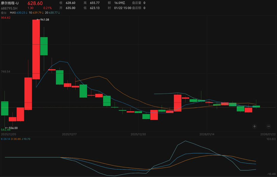 二级市场方面,截至1月22日收盘,摩尔线程股价报628.60元/股(不复权,下同),微涨0.21%,总市值为2955亿元。2026年1月以来,该公司股价涨幅为6.92%,而与去年12月上市初期941.08元/股的最高价相比,已回落33%。