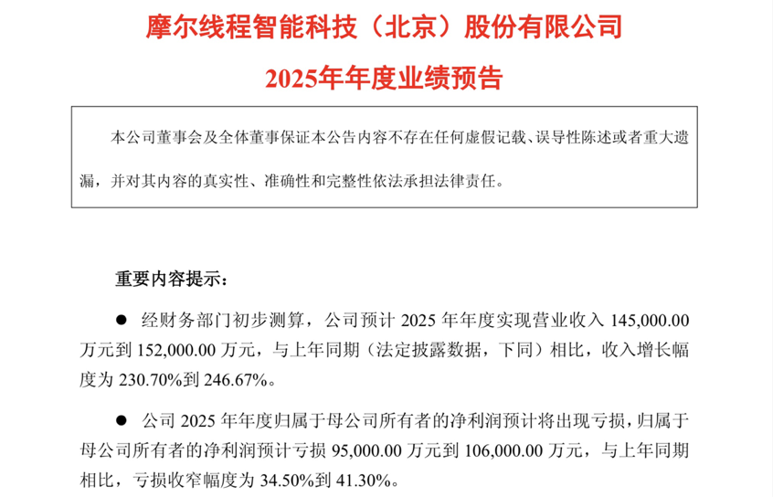 摩尔线程发布2025年年度业绩预告