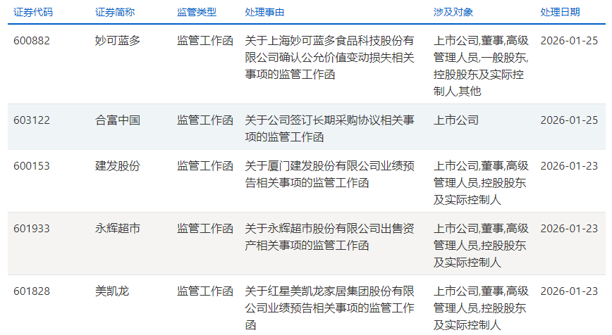 同时,建发股份与美凯龙均收到上交所下发的“关于业绩预告相关事项的监管工作函”,涉及对象包括:上市公司、董事、高管、控股股东及实控人。