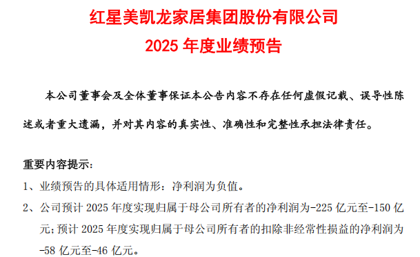 2025年,美凯龙归母净利润预亏150亿元至225亿元,扣非后净利润预计亏损46亿元至58亿元
