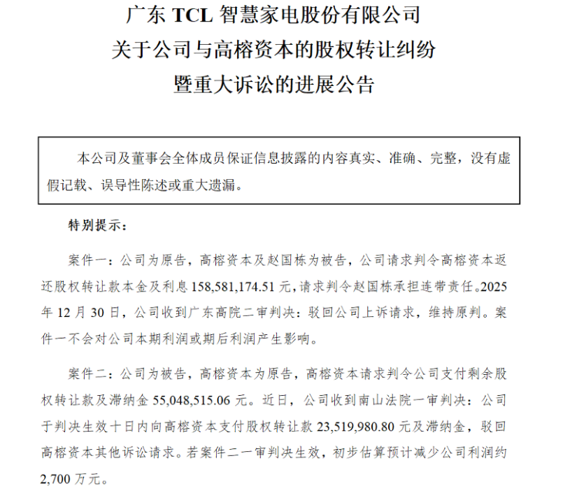根据近期深圳市南山区人民法院的一审判决,TCL智家需在判决生效后十日内向高榕资本支付股权转让款2352万元及相应的滞纳金,法院部分支持了高榕资本的诉求,但对其主张的高额滞纳金予以了驳回。据TCL智家自身测算,若此判决最终生效执行,将直接减少公司利润约2700万元。