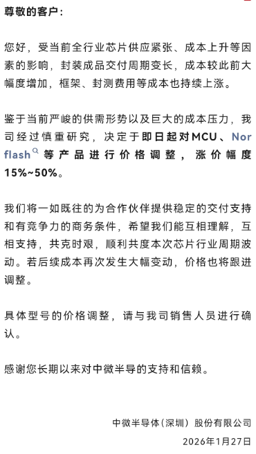 1月27日,中微半导(688380.SH)发布声明,对MCU、Norflash等核心产品提价15%—50%。而在此之前,国科微(300672.SZ)便已宣布,对多款合封KGD产品上调价格40%—80%。