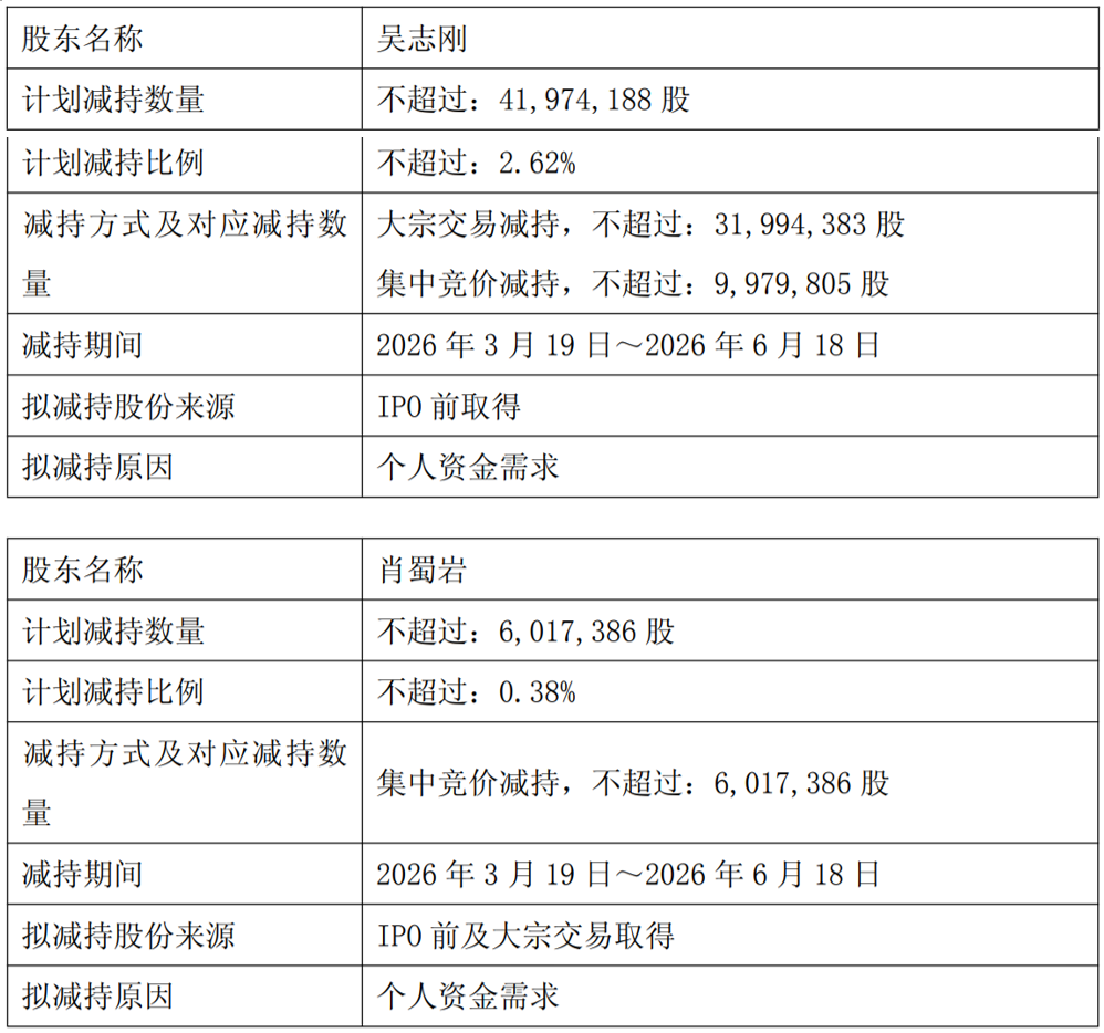 根据安排,吴志刚拟在公告披露之日起15个交易日后的3个月内,通过大宗交易减持不超过3199.44万股,通过集中竞价减持不超过997.98万股,合计拟减持比例达2.62%。肖蜀岩则计划通过集中竞价清仓所持全部601.74万股,占总股本0.38%。