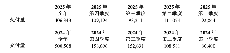 业绩下滑背后是理想汽车交付量的下降。财报显示,2025年全年,公司交付新车40.63万辆,同比下滑18.5%,不仅远低于年初设定的70万辆目标,相较调整后的64万辆目标也仅完成63.5%。这使得理想汽车失去2024年以来的新势力销量冠军位置,被零跑汽车(9863.HK)、小鹏汽车(股票简称:小鹏汽车-W,股票代码:9868.HK)等逐渐超越。