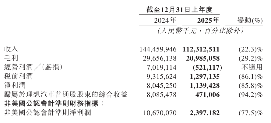 2025年,理想汽车实现营收1123.12亿元,同比下降22.3%;净利润为11.39亿元,同比大跌85.8%