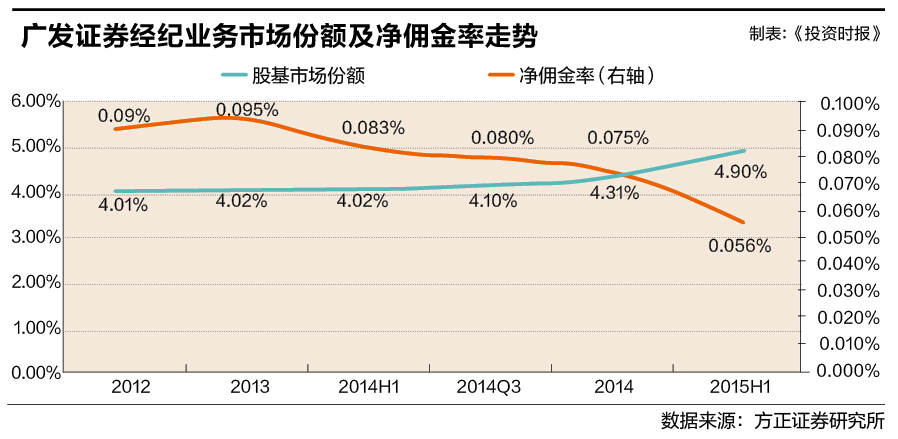 互联网引流效应提振了广发证券的市场份额。方正证券报告显示,2015上半年,广发证券股票及基金交易市场份额达到4.9%,比2014年上升14%,行业排名第五;经纪业务收入80.8亿元,同比增长431%。