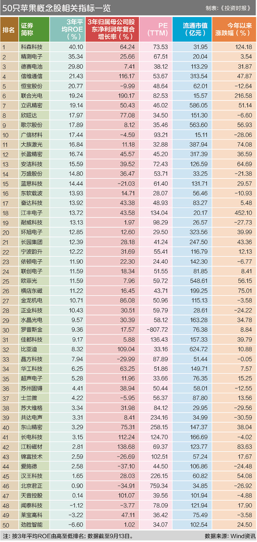 标点财经研究院联合《投资时报》对A股50只苹果概念股过去三年的盈利能力和成长能力进行了研究。结果显示,50家公司三年平均ROE(即净资产收益率)的中位数为11.41%,其中科森科技、精测电子、德赛电池、信维通信以及恒宝股份均达到20%以上;过去三年净利润复合年增长率中位数为26.84%,超过30%的有23家,其中联合光电、江粉磁材、信维通信、长电科技、比亚迪、天音控股的复合年增长率均在100%以上。