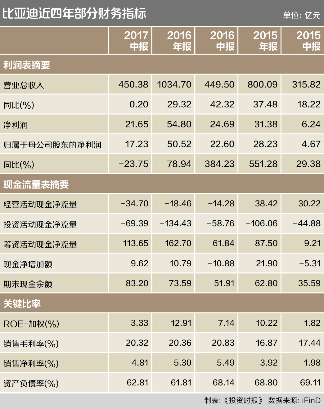 据该公司最新披露的半年报显示,2017年上半年比亚迪实现营业收入为450.38亿元,同比微增0.20%,相对于去年同期42.32%的营收同比增长幅度着实逊色不少。