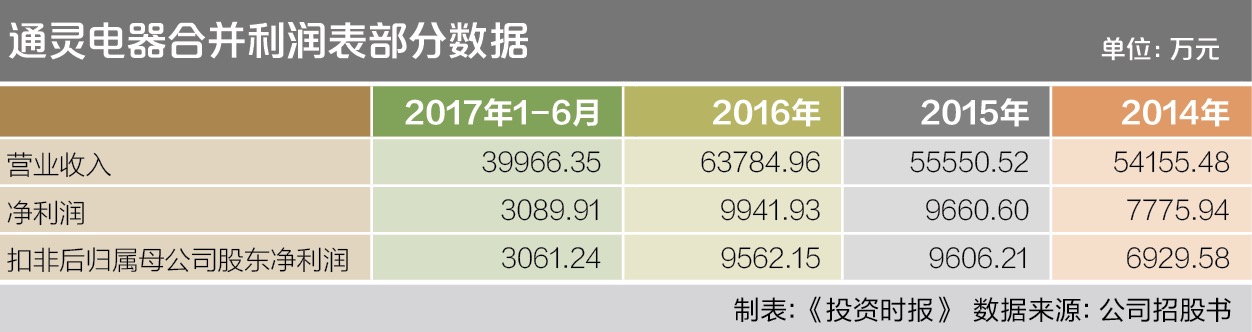 招股说明书显示,通灵电器98%以上的营业收入都来自接线盒及相关配件等产品。其中,从2014年至2016年及2017年上半年(下称“报告期”),接线盒所带来的业务收入分别为5.30亿元、5.47亿元、6.18亿元、3.73亿元,占主营业务的收入比例分别为99.16%、98.53%、96.84%、93.32%。而且,接线盒产品所带来的业务收入在2015和2016年较前一年分别增长3.27%和12.84%,增长率呈逐年上升态势。