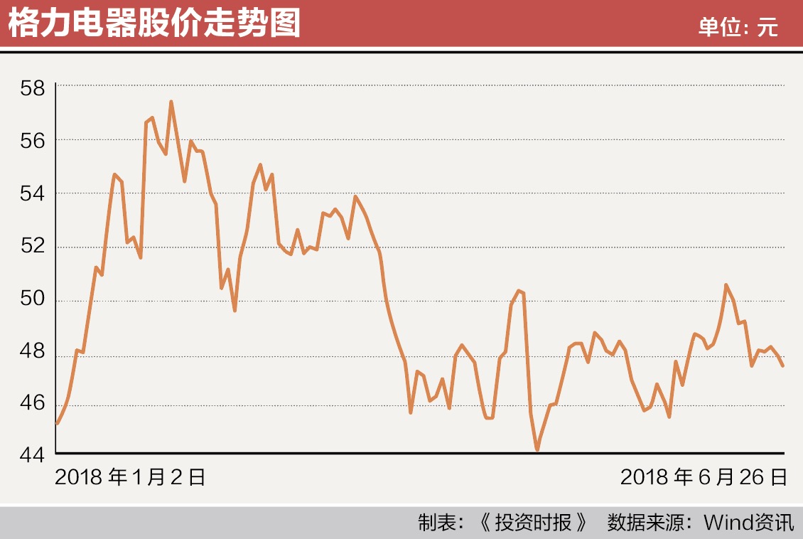 股东大会结束当日,格力电器收于47.3元/股。6月27日,该股以47.36元高开,但截至午盘收盘小跌1.59%。目前,格力电器股价已较52周高点回落20.7%。毫无疑问,除了大市整体走软,董明珠动向的不明确也让投资者多少添加了一丝小心。