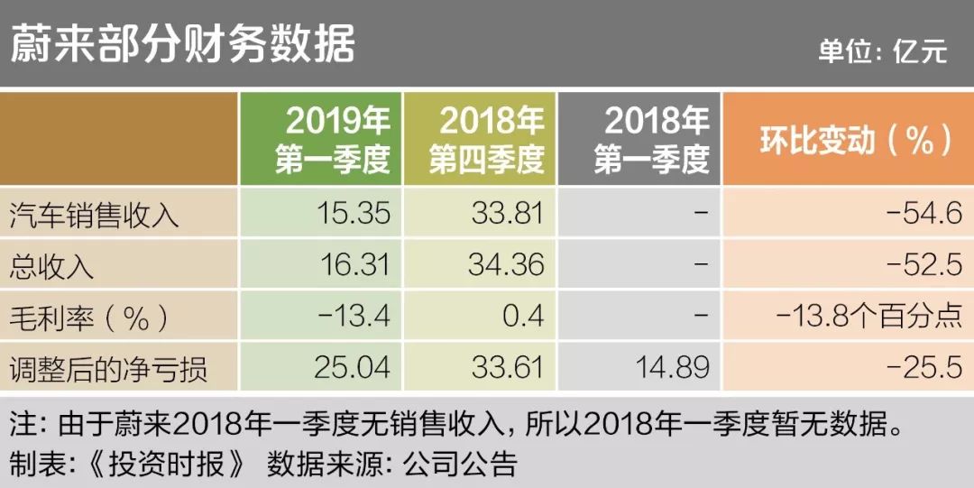 麻烦的是,蔚来的亏损还在继续。2019年一季度经调整后的净亏损为25亿元,同比增长68.2%,但较2018年四季度调整后净亏损33.61亿元有所缩小。不过,相比于上年四季度0.4%的正向毛利率,今年一季度其毛利率为-13.4%,呈进一步恶化的情况。