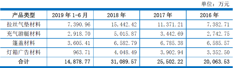 华生科技的主要产品包含四类,分别为:拉丝气垫材料、充气游艇材料、篷盖材料和灯箱广告材料。报告期内,拉丝气垫材料销售收入分别为0.74亿元、1.14亿元、1.54亿元和0.74亿元,占公司主营业务收入比例分别为36.18%、43.84%、49.03%和49.05%,占比高且比例逐年提升。