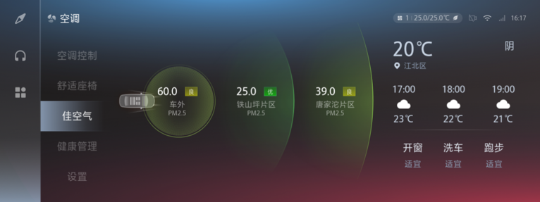 “智能健康气候控制系统”受到业内专家和用户的一致点赞。这项技术到底有多牛?只要按下键,就能实时提供车外和车内的环境监测服务和生活贴士服务,准确获悉3小时、24小时、7天的天气预报,与车内语音系统联动,自动播报当日天气,并为车内外环境健康进行影响评估,提供专属健康报告。佳华科技在持续不断地发展生态环境大数据,长安汽车通过空气传感器所采集到的车外环境移动数据资源,二者互为补充,不仅增加佳华科技“全国生态环境大数据”的数据来源,还可为长安汽车提供更为精准的环境数据支持。