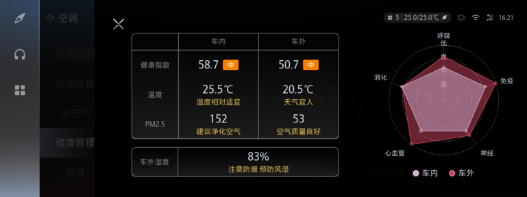 新型冠病毒大多是通过飞沫、粉尘、气溶胶进行传播,车主上车时,在智能健康气候控制系统的联动下,前端的颗粒物传感设备可监测车内、车外空气质量,当监测到污染病毒时,可以智能联动PM0.1高效复合抗病毒过滤器、空调过滤器、紫外线消毒器等设备,形成车内空气治理的闭环,使漂浮在空气中的病毒可以被有效过滤和隔离。整车对体积≥0.3μm的颗粒物过滤效果达到97.7%,优于“N95口罩”级别防护,有效保障车内的空气安全。