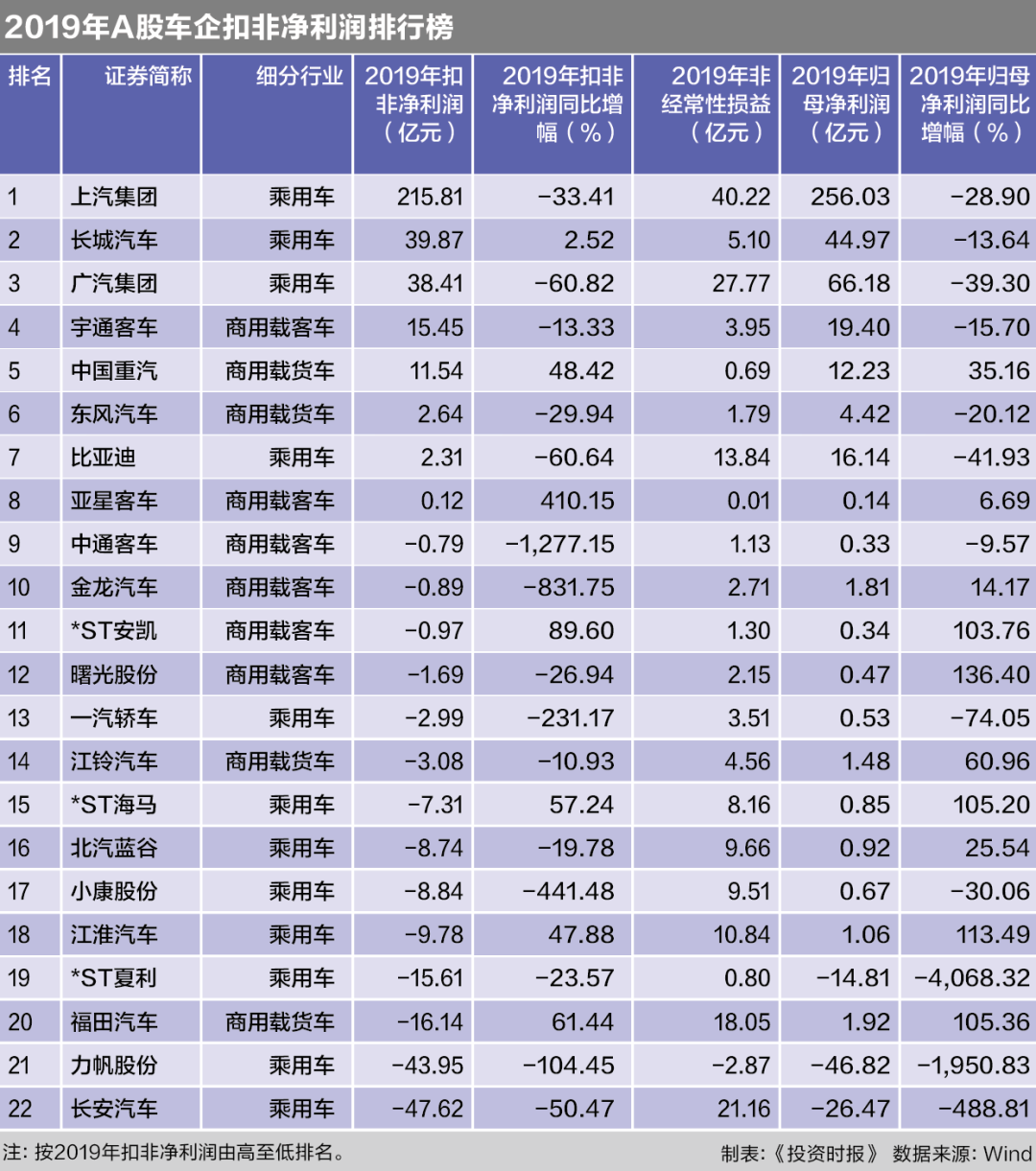 只有8家公司2019年的扣非净利润为正。上汽集团(600104.SH)以215.81亿元排在首位,是唯一一家2019年扣非净利润超过50亿元的A股整车企业。实现正收益的还有长城汽车(601633.SH)、广汽集团、宇通客车(600066.SH)、中国重汽(000951.SZ)、东风汽车(600006.SH)、比亚迪(002594.SZ)和亚星客车(600213.SH)。