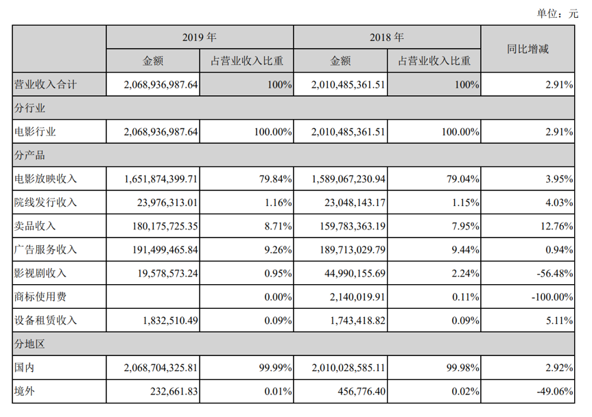 从收入构成上看,电影放映、广告服务和卖品收入分别实现16.52亿元、1.91亿元和1.80亿元营收,占总收入的比重分别为79.84%、9.26%和8.71%,显然,电影放映收入是该公司的收入核心。