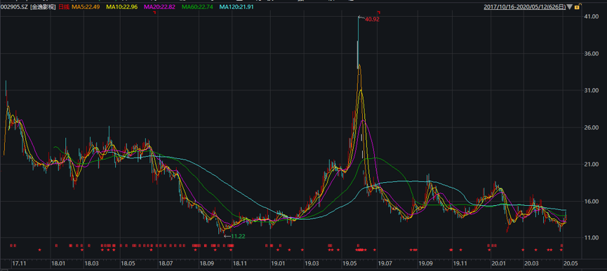 截至5月12日收盘,金逸影视收于13.98元/股,较2019年5月创下的40.92元/股历史高点,下挫65.84%。
