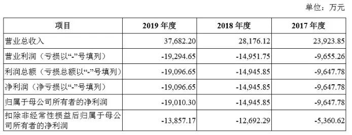 报告期内,该公司营业总收入分别为2.39亿元、2.82亿元和3.77亿元,2018年和2019年同比上一年增速分别为17.66%和33.89%。不过该公司净利润连续三年发生亏损,报告期内亏损净额分别为9647.78万元、1.49亿元和1.91亿元,扣除非经常性损益后归属于母公司所有者的净亏损分别为5360.63万元、1.27亿元和1.39亿元,三年总计亏损4.37亿元。