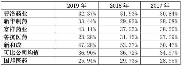 同时,与可比较上市公司相比,国邦医药的毛利率显著低于其平均水平。去年五家上市公司,包括普洛药业(000739.SZ)、新华制药(000756.SZ)、富祥药业(300497.SZ)、鲁抗医药(600789.SH)、新和成(002001.SZ),它们2019年的平均毛利率为36.9%,而国邦医药毛利率仅有25.94%。