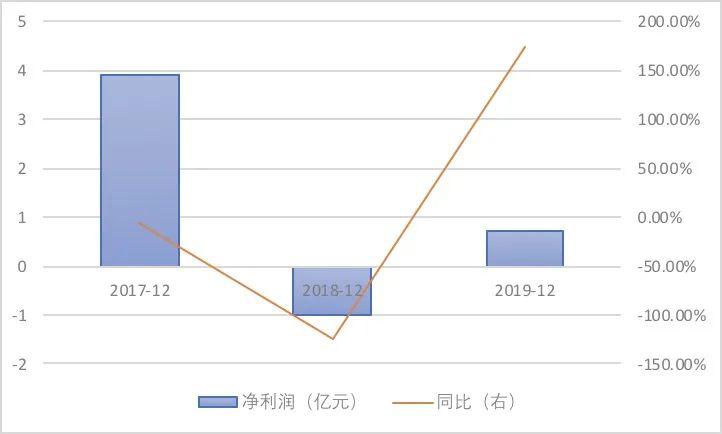 除了持续下滑的营业收入,未名医药净利润总体上也处于下降趋势,2018年甚至出现了亏损,亏损额达0.89亿元,2019年虽转亏为盈,但仅为0.77亿元,相较于2017年净利润跌幅高达83.46%。