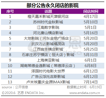 疫情已致使很多影院陷入生存困境,极度依赖现金流的影院由于收入结构单一,缺失票房来源后,无法支付高额的房租、物业和人力费用,已倒在了影院复工之前。据艺恩数据的不完全统计,截至6月19日,已有至少13家电影院宣布永久闭店。而企查查数据显示,截至今年7月14日,我国共有12421家经营范围含“影视”的企业注销。
