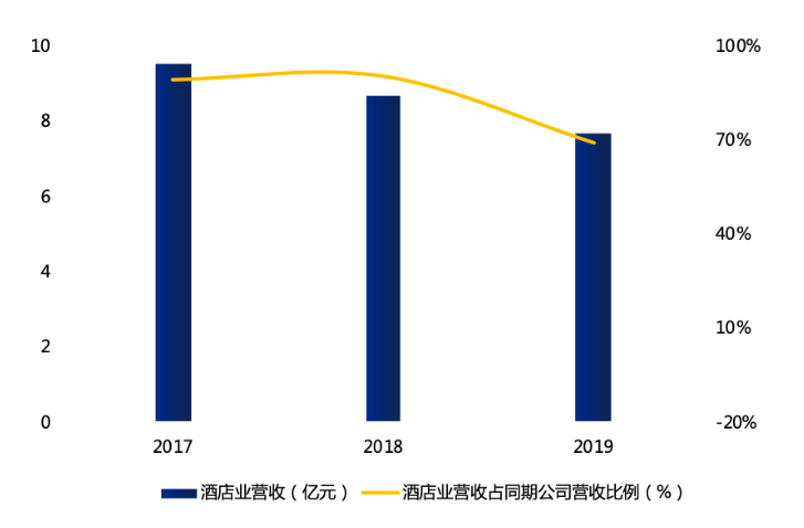 《投资时报》研究员注意到,近几年,该公司酒店业营收规模呈现下降趋势。数据显示,2017年—2019年,其酒店业分别实现营收9.5亿元、8.67亿元、7.65亿元,占同期营收的比例分别为89.39%、90.51%、68.84%。