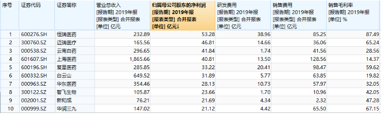 数据显示,2019年行业龙头恒瑞医药实现营业收入232.89亿元,同比增长33.70%;实现归母净利润53.28亿元,同比增长31.05%,位列十大上市药企之首。