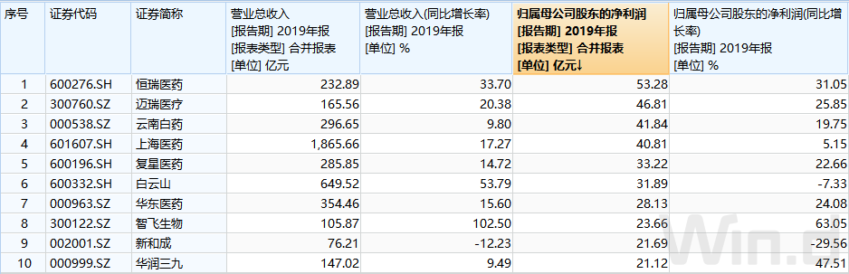 日前,《投资时报》研究员整体梳理了A股医疗保健行业2019年归母净利润排名前十的上市公司,它们分别是恒瑞医药(600276.SH)、迈瑞医疗(300760.SZ)、云南白药(000538.SZ)、上海医药(601607.SH)、复星医药(600196.SH)、白云山(600332.SH)、华东医药(000963.SZ)、智飞生物(300122.SZ)、新和成(002001.SZ)和华润三九(000999.SZ)。