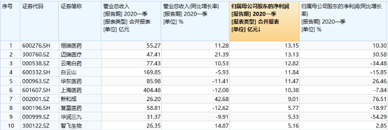 十大上市药企2020一季度营收及归母净利润情况