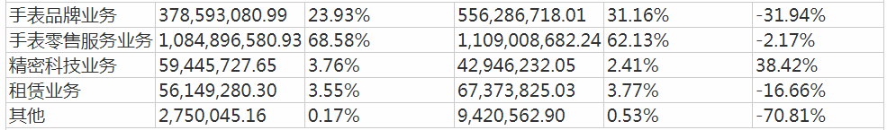 《投资时报》研究员留意到,分产品来看,报告期内,该公司手表品牌业务实现3.79亿元营收,占比23.93%,收入较上年同期减少31.94%;手表零售业务实现10.85亿元收入,占比达68.58%,收入同比减少2.17%;精密科技业务实现营收0.59亿元,占营收比3.76%,收入同比增加38.42%;租赁业务实现营收0.56亿元,占营收比3.55%,收入同比减少16.66%。