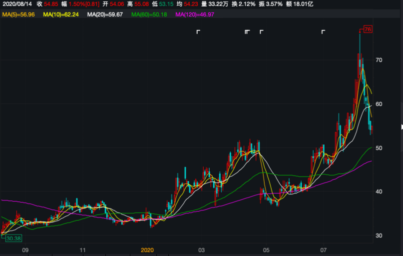 截至2020年8月14日,华兰生物报收于54.85元/股,较52周高点已下挫27.8%。