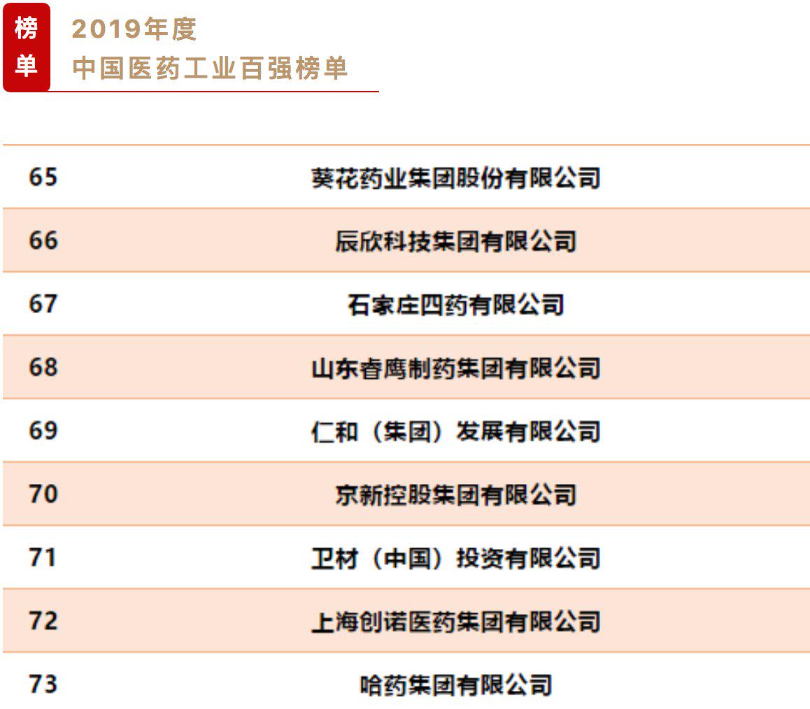 葵花药业荣登“2019年度中国医药工业百强榜单”,排名较去年晋升了8个席位,名列第65位 。