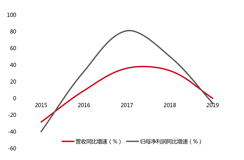 格力电器2015年—2019年营收及归母净利润同比增速(%)