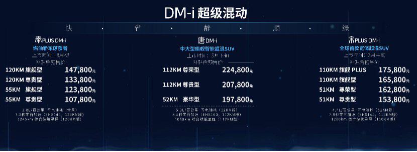DM-i超级混动发布即量产,秦PLUS DM-i、宋PLUS DM-i、唐 DM-i三款DM-i超级混动车型在此次发布会上启动预售。其中,秦PLUS DM-i补贴后预售价格为10.78万元-14.78万元,宋PLUS DM-i补贴后预售价格为15.38万元—17.58万元,唐 DM-i补贴后预售价格为19.78万元—22.48万元。