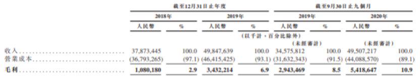 作为技术驱动的供应链解决方案及物流服务商,京东物流主要通过科技赋能,提供全方位的覆盖各个业务领域的供应链解决方案和物流服务,从仓储到配送,从制造端到终端客户,涵盖普通和特殊物品。2018年至2019年及2020年三季度末(下称报告期),京东物流实现收入依次为379亿元、498亿元、495亿元,同比变动幅度为48.2%、31.6%、43.2%;毛利率依次为2.9%、6.9%、10.9%。