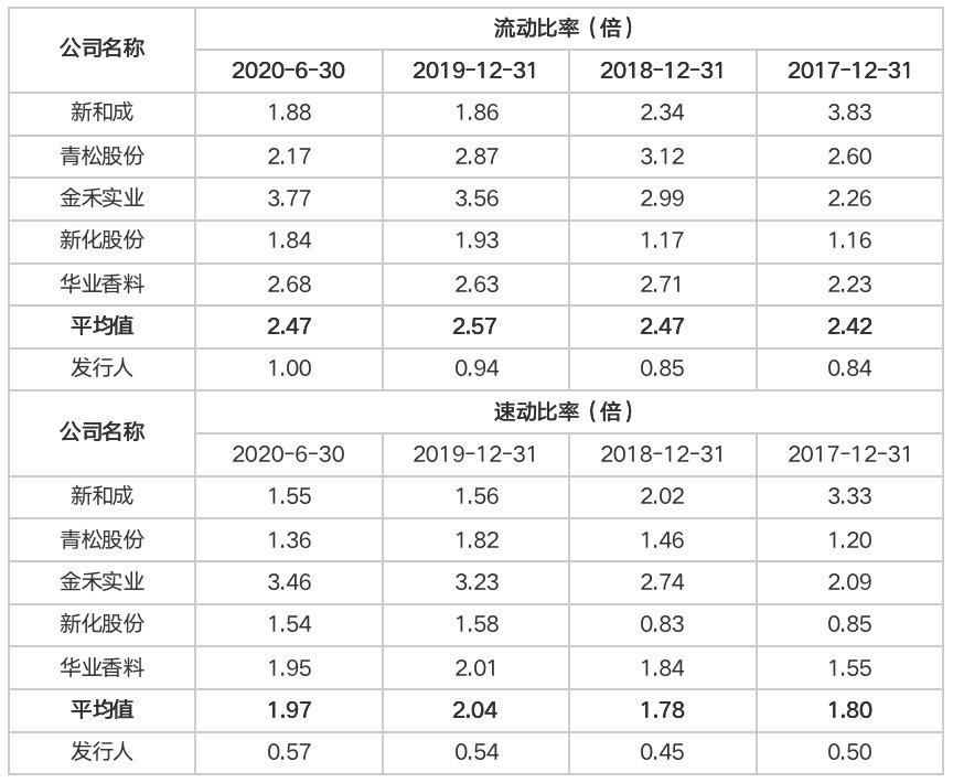 同时招股书显示,截至2020年6月末,万香科技短期借款余额为2.69亿元。而报告期内,该公司资产负债率分别为70.2%、65.68%、53.1%和50.99%,较同业可比公司平均水平高超过20个百分点。同期,其流动比率分别为0.84、0.85、0.94和1,速动比率水平表现更为不乐观,分别为0.5、0.45、0.54和0.57,均不及同业可比公司平均水平的一半。