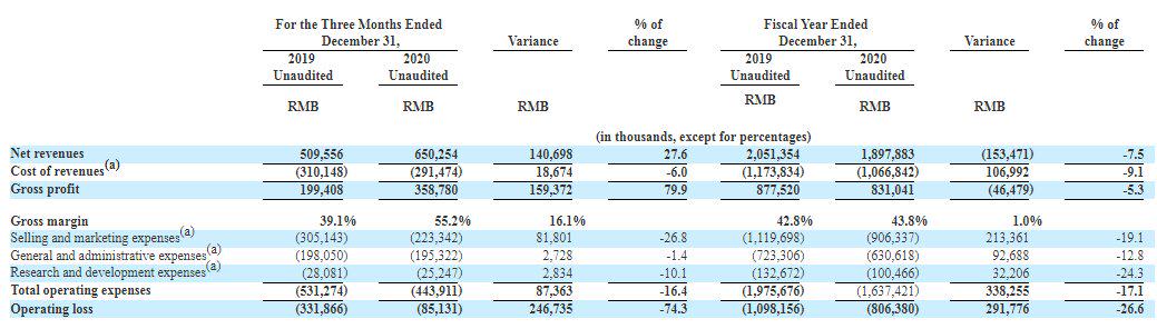 全年来看,其实现净收入18.98亿元,同比下降7.5%;净利润为-7.71亿元,较2019年的-10.39亿元,同比变动幅度25.8%;净利润(non-GAAP)为-7.35亿元,同比变动26.5%。