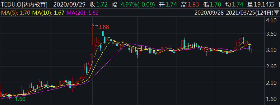 截至2021年3月25日,达内教育报收于3.02美元/股,较其上市以来的最高位21.46美元/股(前复权),下挫86%。