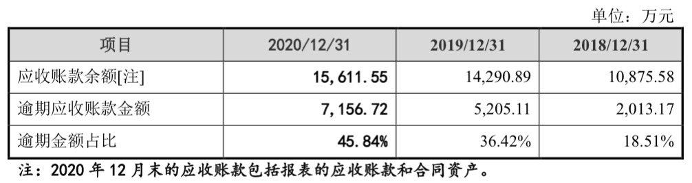 值得注意的是,根据信用政策,佳缘科技客户的回款期限一般在1年以内,因此该公司会将验收后满1年尚未支付的款项作为逾期款项。报告期各期末,佳缘科技逾期应收账款分别为2103.17万元、5205.11万元、7156.72万元,占应收账款余额的比重分别达到18.51%、36.42%、45.84%。
