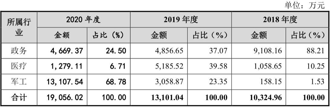 从行业分类来看,2018年该公司以政务行业为主要收入来源,政务类营业收入占比为88.21%;2019年起,佳缘科技调整发展战略,向医疗和军工业务方向拓展,政务类营收占比大幅缩减至37.07%。截至2020年12月31日,其政务类业务营收近一步收窄,占总营收比重下降至24.50%。
