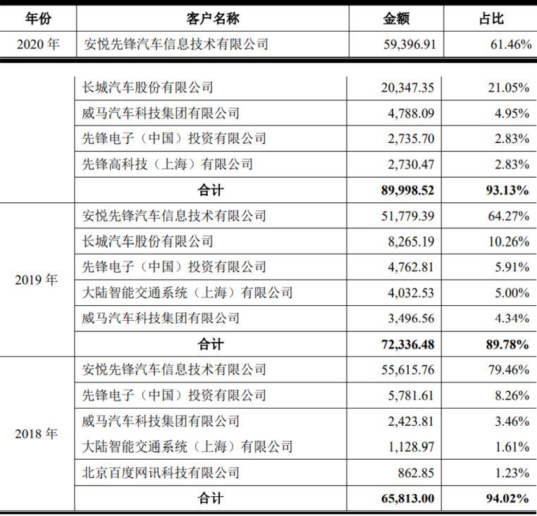 而远峰科技营业收入尤为依赖其第一大客户——安悦先锋汽车信息技术有限公司(上汽通用的一级供应商,下称安悦先锋)。报告期内,该公司对安悦先锋的销售额占营业收入的比重分别为79.46%、64.27%和61.46%。