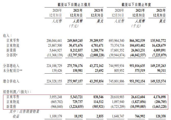 2021年第四季度及全年京东零售、物流及新业务业绩情况(千元)