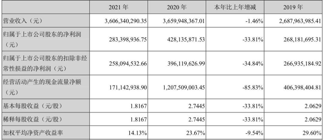 据最新披露的财报显示,2021年小熊电器实现营业收入36.06亿元,同比下滑1.46%;实现归母净利润2.83亿元,同比下滑33.81%;归属于上市公司股东的扣非净利润为2.58亿元,同比下降34.84%。2021年,小熊电器经营性现金流量净额为1.71亿元,同比大幅下降85.83%。
