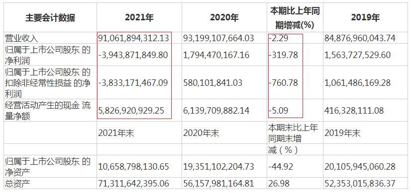 年报数据显示,2021年,永辉超市实现营业收入910.62亿元,同比下降2.29%;净亏损44.95亿元,同比降幅为371.87%;归属于上市公司股东的净利润(下称归母净利润)为-39.44亿元,同比下降319.78%。经营活动产生的净现金流为58.27亿元,同比下滑5.09%。