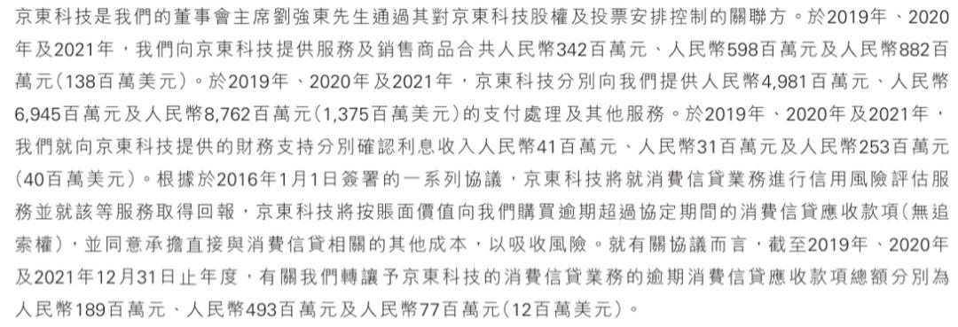 2019年、2020年和2021年,京东向京东科技提供服务和销售商品的总额分别为3.42亿元、5.98亿元和8.82亿元(约合1.38亿美元)。在此期间,京东科技分别先京东提供的支付处理和其他服务金额分别为49.81亿元、69.45亿元和87.62亿元(约合13.75亿美元)。