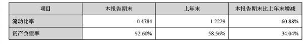年报数据显示,截至2021年末,正邦科技资产负债率为92.60%,上年末该数据为58.56%,这也是公司自上市以来负债率的最高点。其流动比率和速动比率也分别从上年的1.22、0.70降至今年的0.48和0.25。